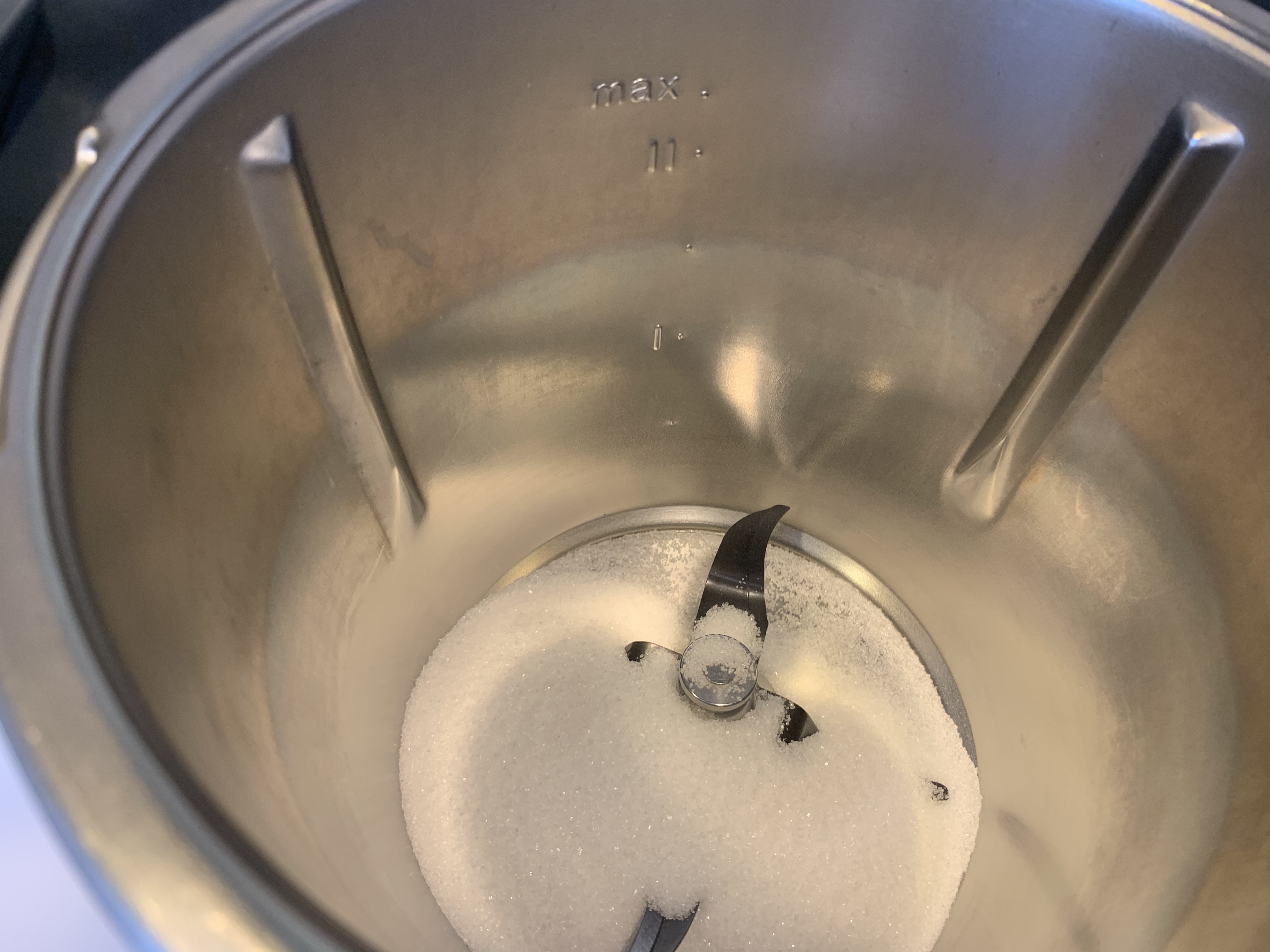 Precaliente el horno a 180º. Pulverice el azúcar programando 1 minuto, velocidad progresiva 5-10.