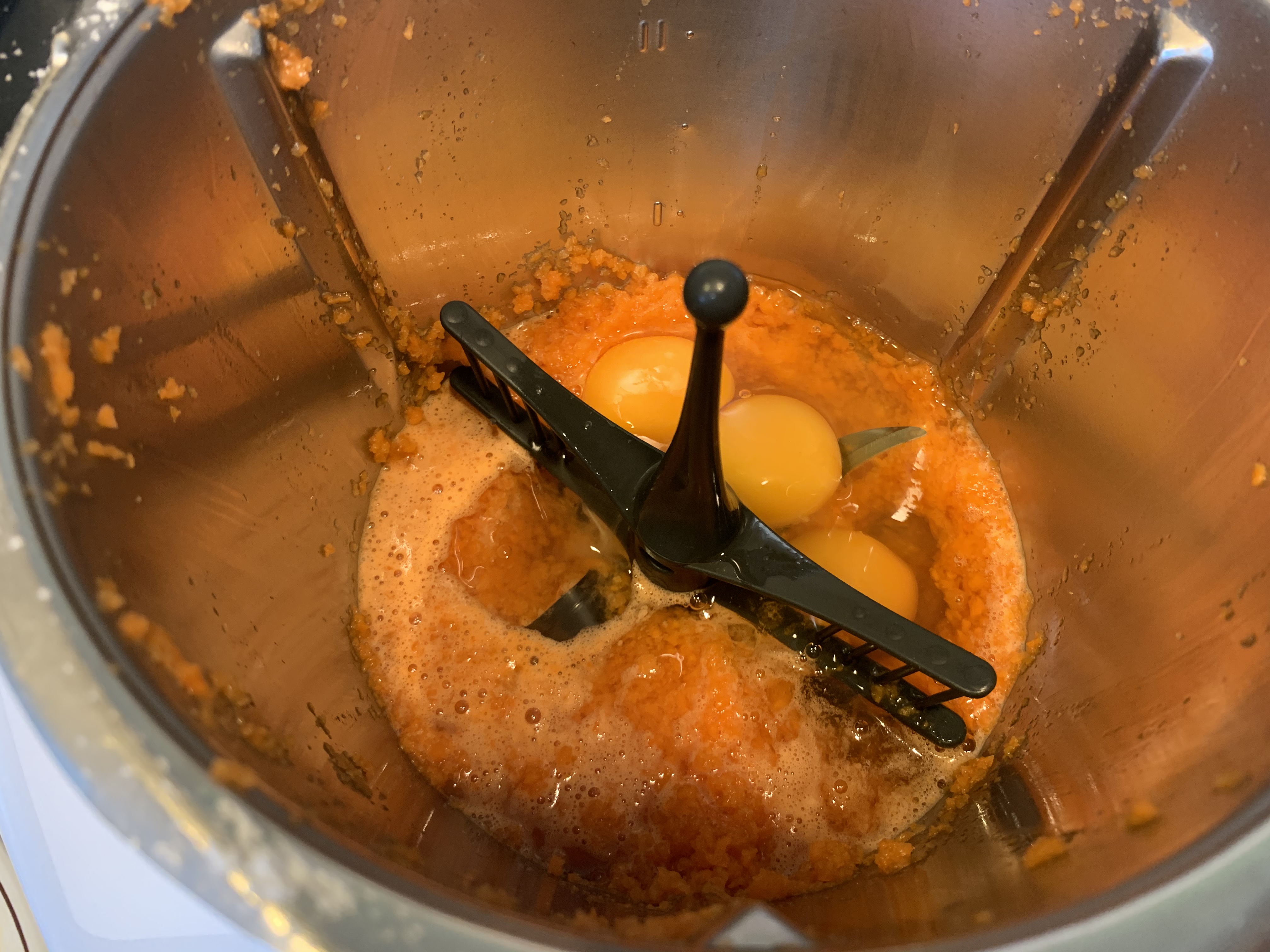 Coloque la mariposa en las cuchillas. Añada los huevos y programe 2 minutos, 37º, velocidad 3.