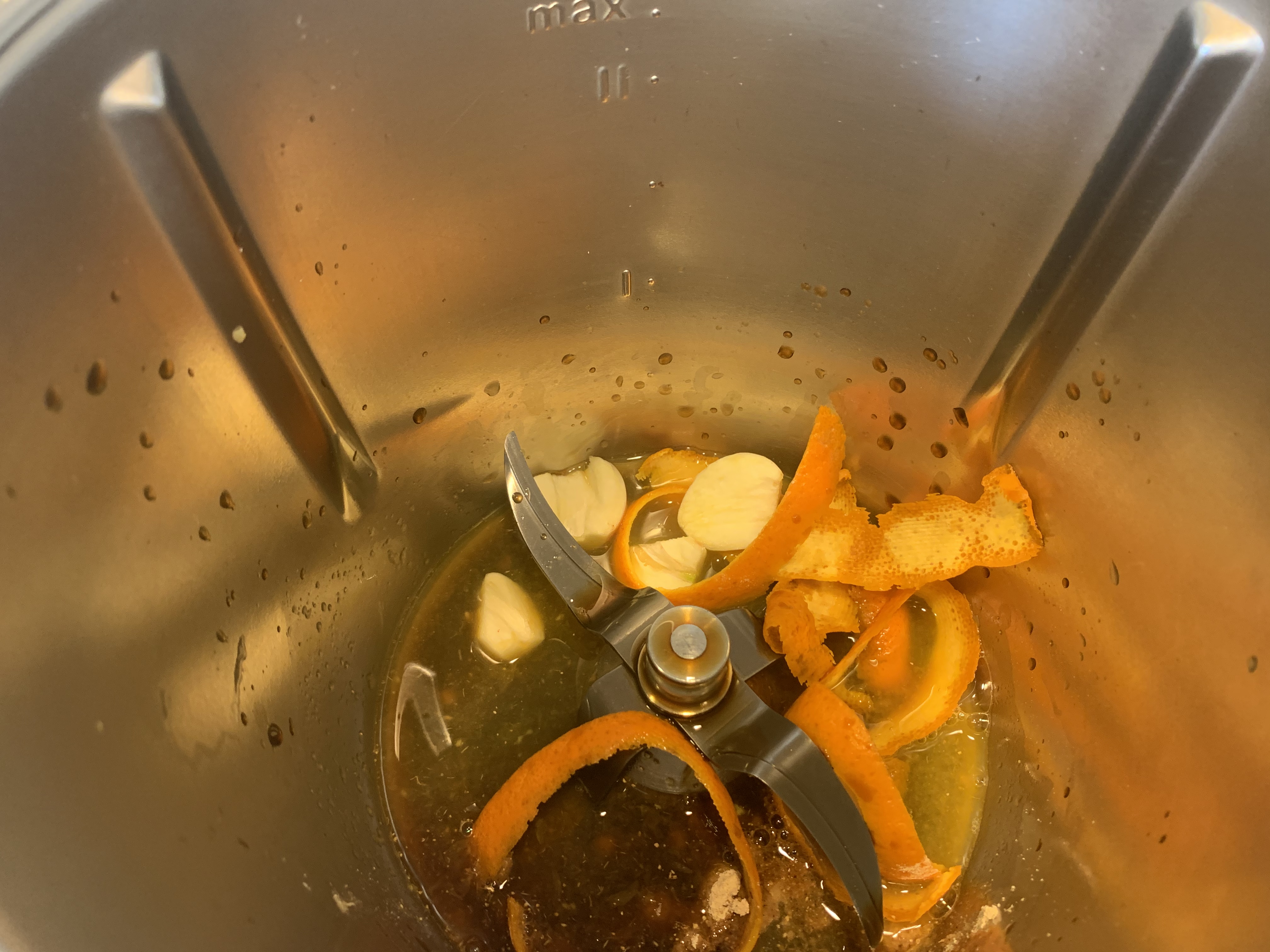 Ponga en el vaso el jengibre, la piel de naranja , el zumo de naranja , la salsa de soja y los dientes de ajo y triture 5 seg/vel 8.