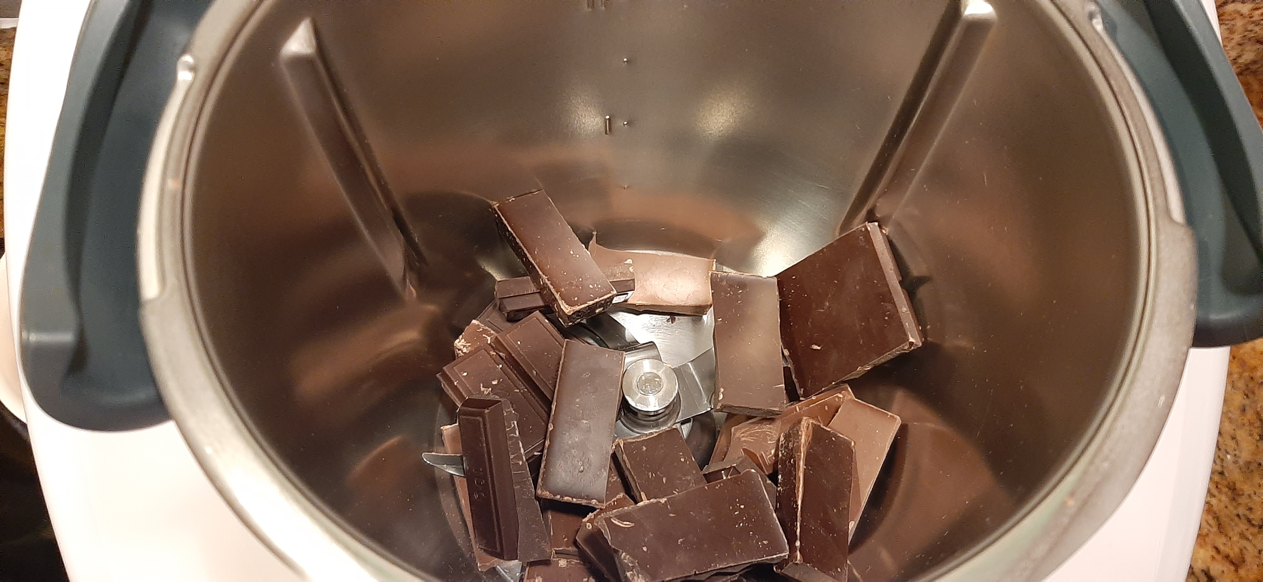 Ponemos en el vaso el chocolate fondant y el chocolate con leche, rayamos 30 seg/vel 10.