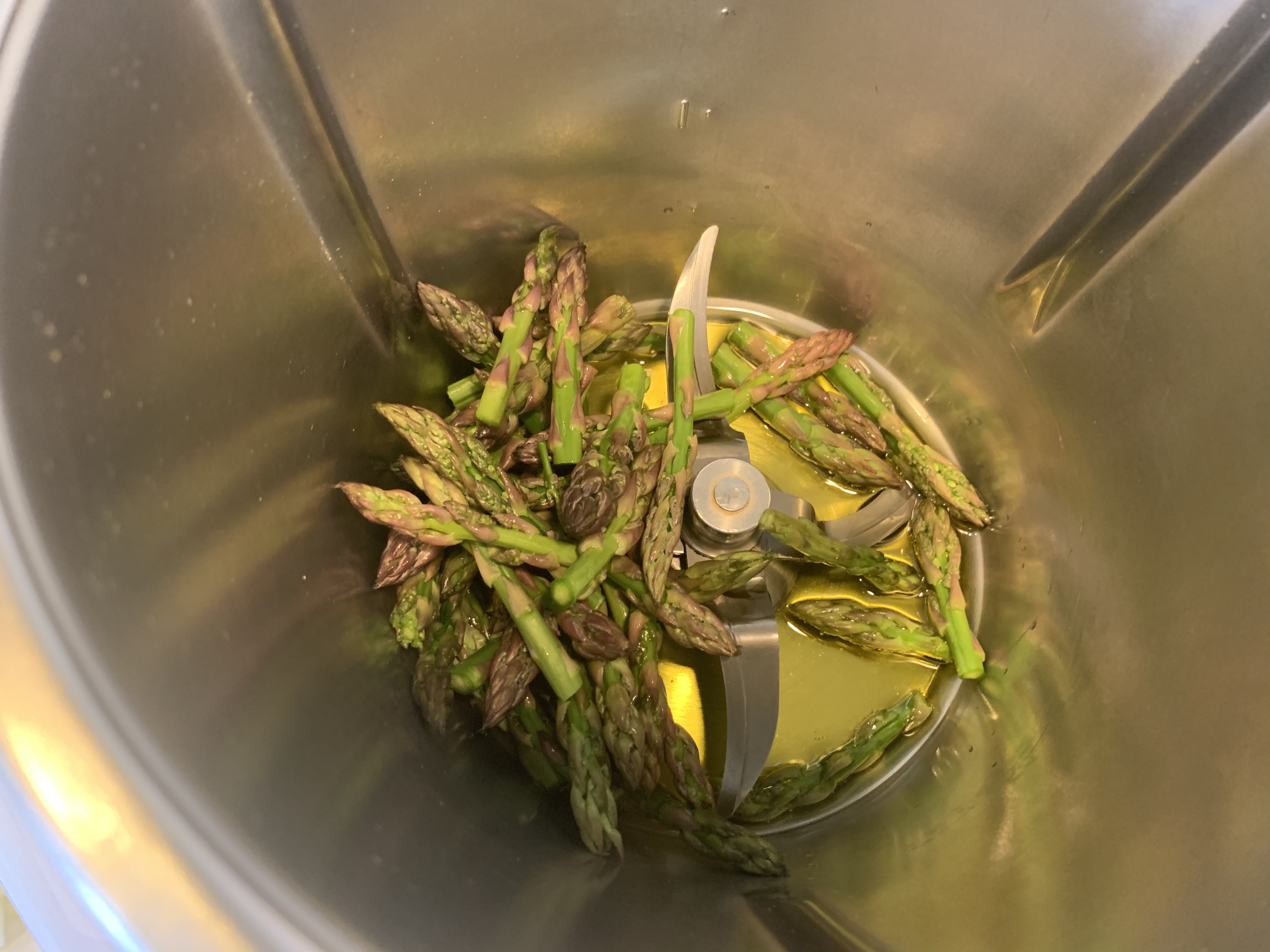 3. Añadimos las yemas de los espárragos y las rehogamos 2 min/120º/ giro a la izquierda/vel cuchara. Una vez rehogadas, las retiramos sin quitar el aceite y las reservamos.