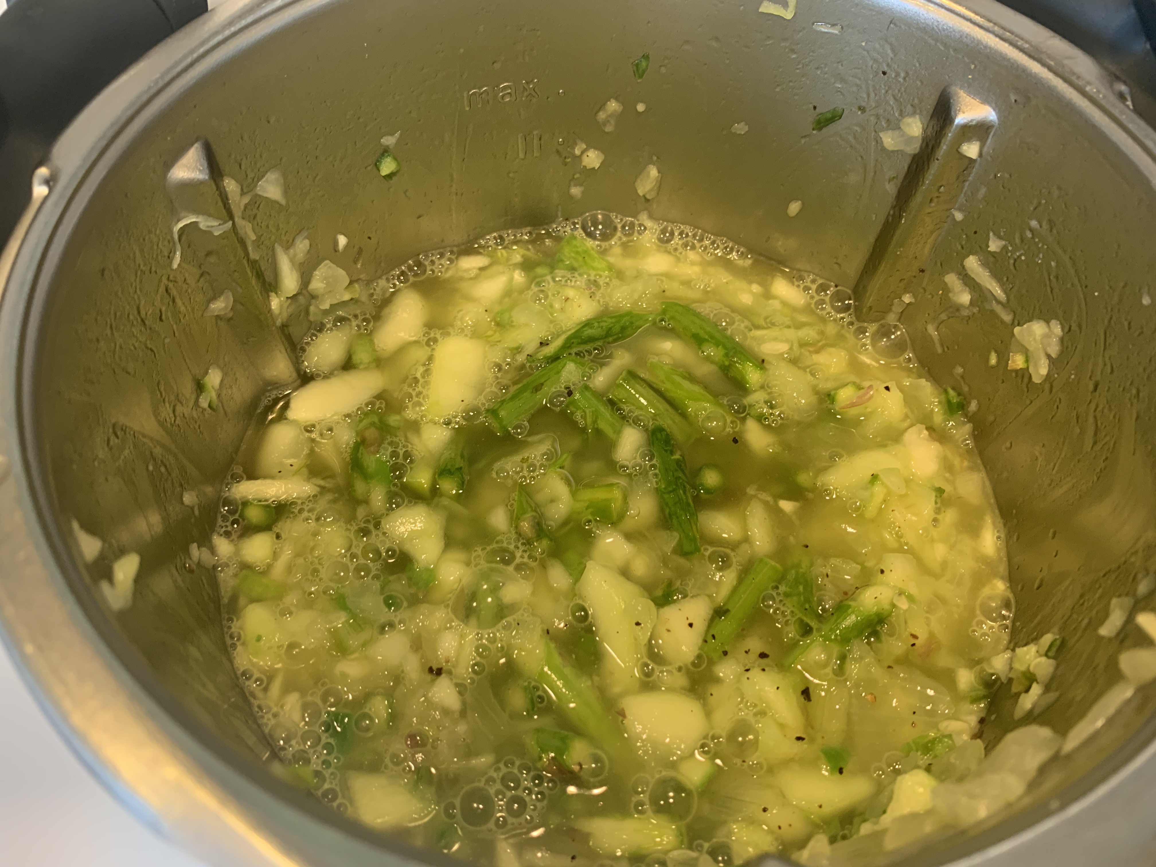 5. Después echamos en el vaso el calabacin y los espárragos y troceamos 4 seg/vel 4 y a continuación rehogamos 2 min/T varoma /vel 1.