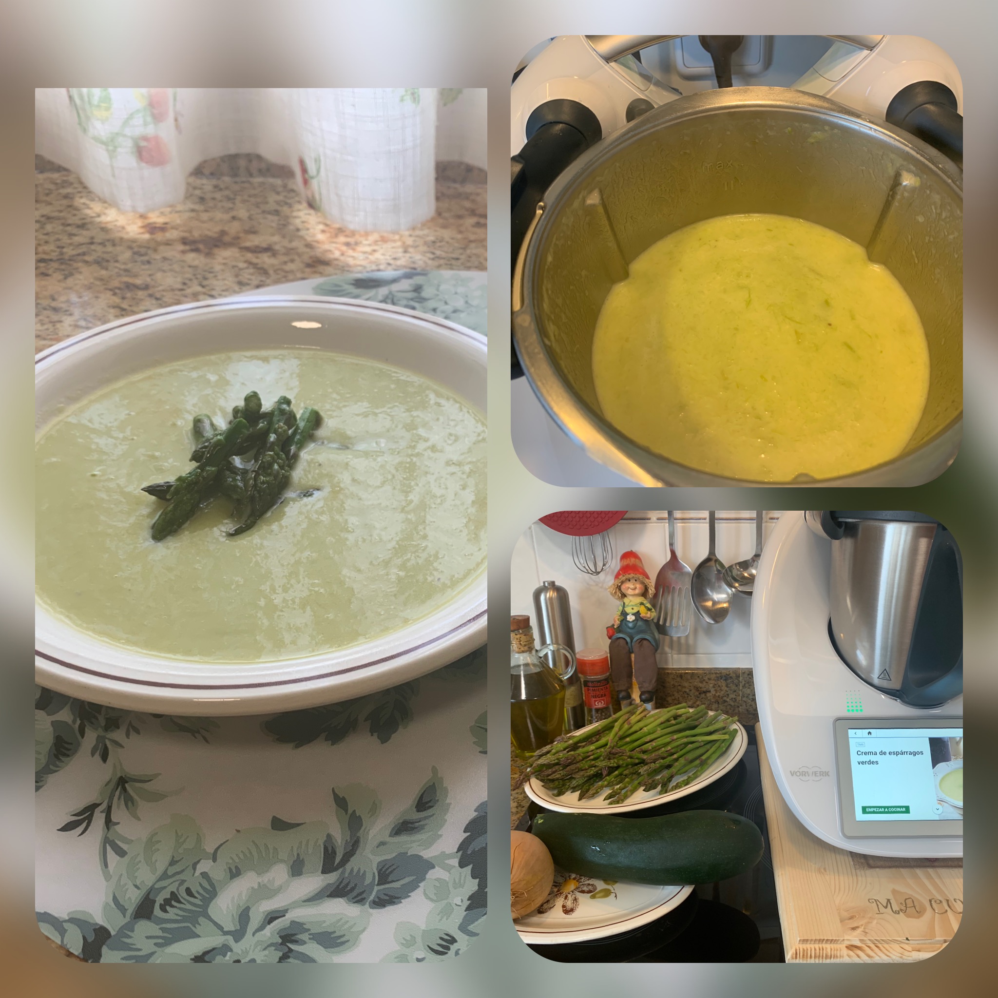 Esta crema de espárragos verdes trigueros con Thermomix queda buenísima, con una textura muy fina y sin ningún tipo de fibra ni grumo. Al sabor contribuye el sofrito de cebolla y el añadido del calabacín y queda de lo más apetecible. Como toque final, las puntas de espárragos ligeramente salteadas quedan aún un poco crujientes y se sirven sobre la crema para aportar un contraste fantástico.
