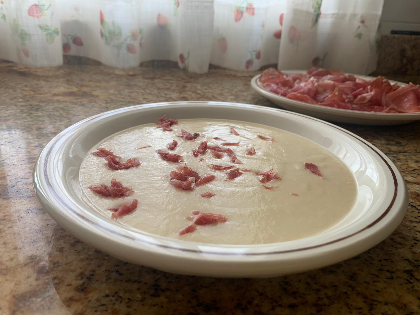 Crema de puerros y pera con jamón